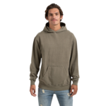 Discontinued 8.5 oz., 80% ring-spun USA cotton/20% polyester Pigment-dyed Enzyme washed Jersey lined hood Extended rib cuff and wasitband Side-seamed construction No drawstrings Crossover hood closure Drop shoulder fit Tear Anywhere label USMCA certified Due to the unique pigment dying process we suggest using methods and inks that avoid dye migrations. When applying white ink, use a gray plastisol blocker under base, flash then poly white